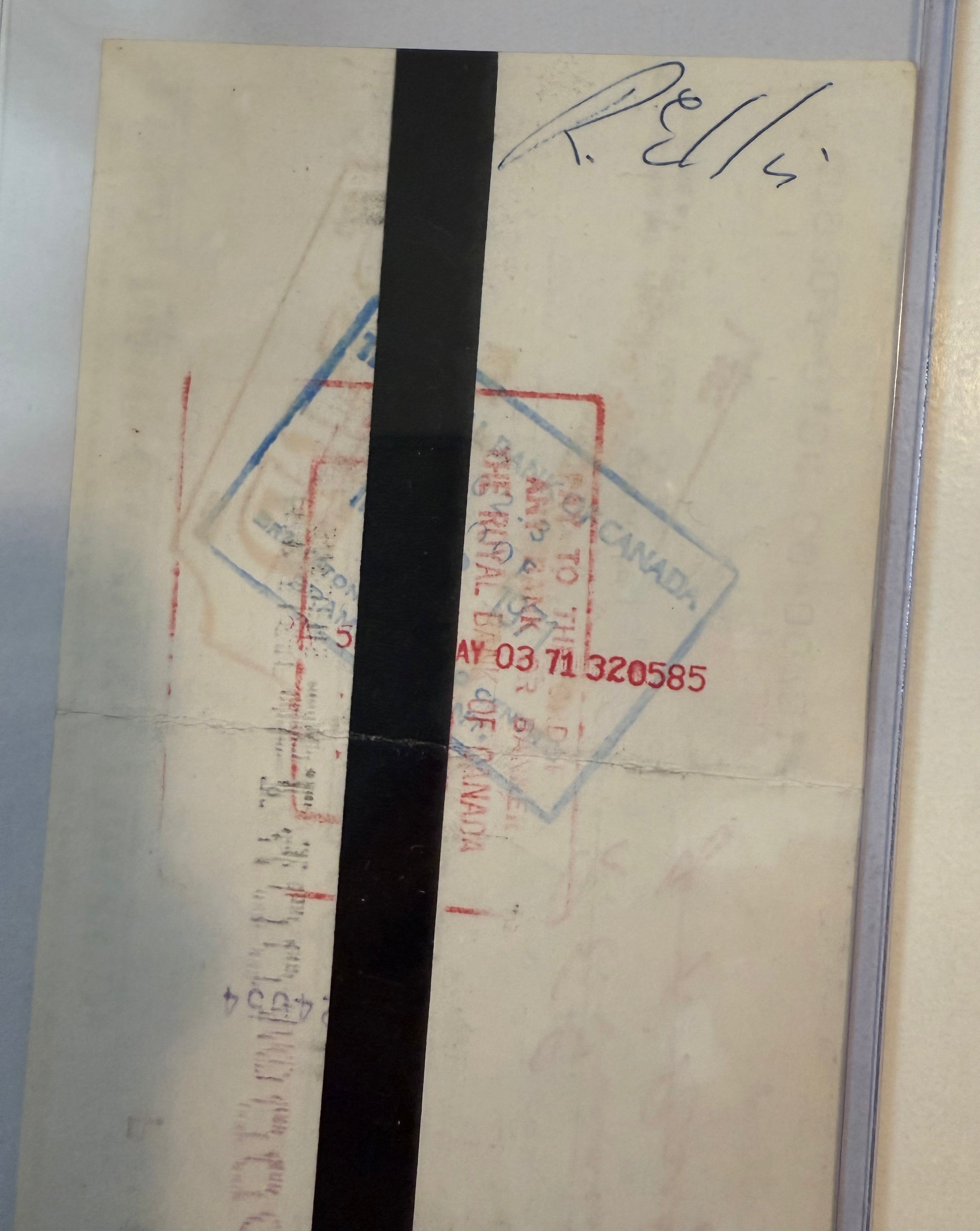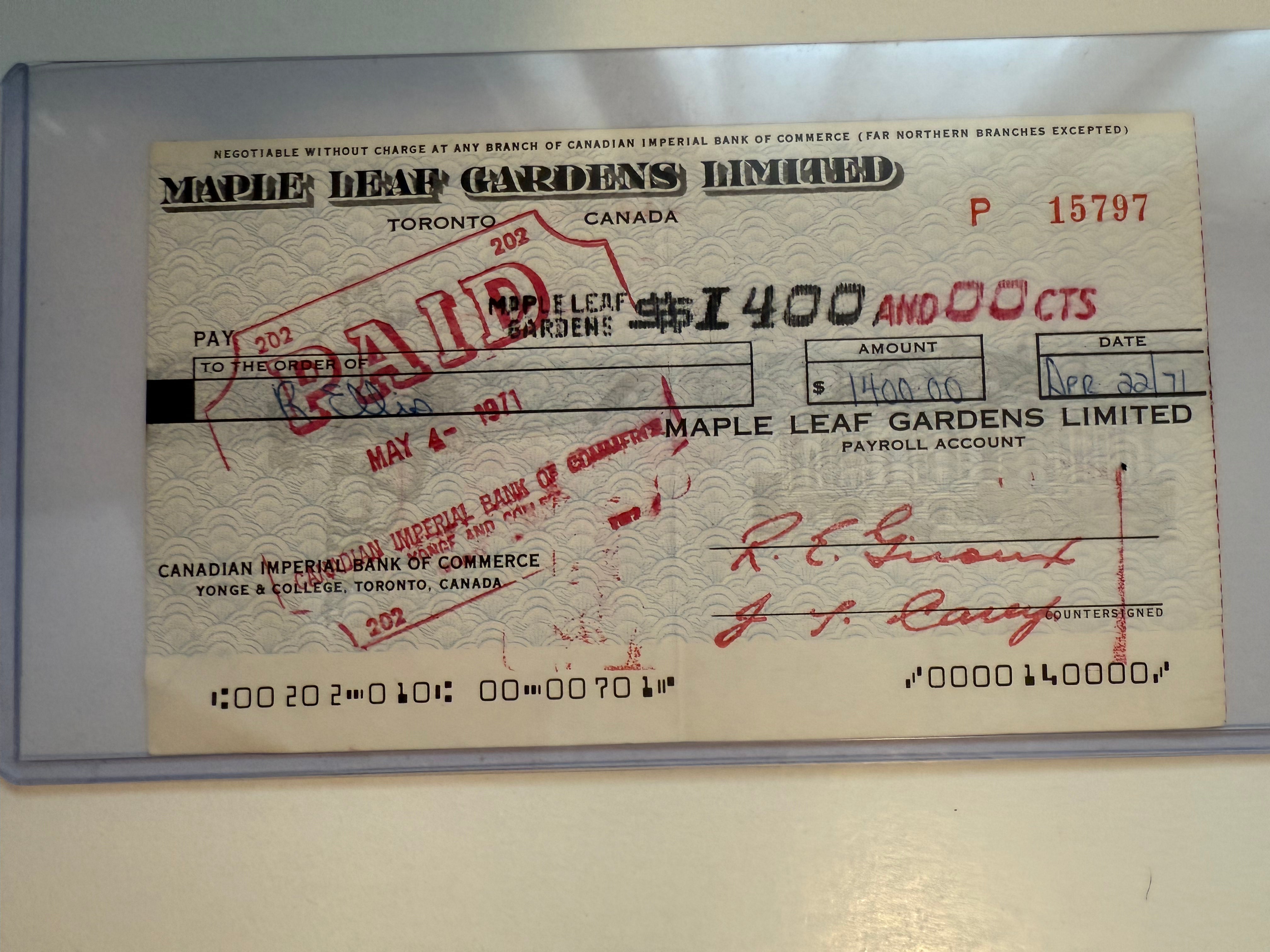 Ron Ellis autographed Gardens Leafs cheque from 1971