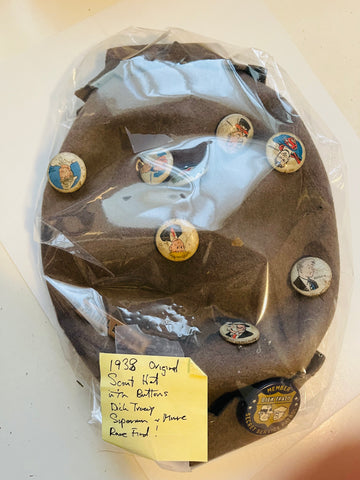 Great find rare original page boy hat with pep buttons and Dick Tracy button. 8 pep buttons from 1938. rare Superman button and Dick Tracy larger button on the hat. amazing find and great value deal!