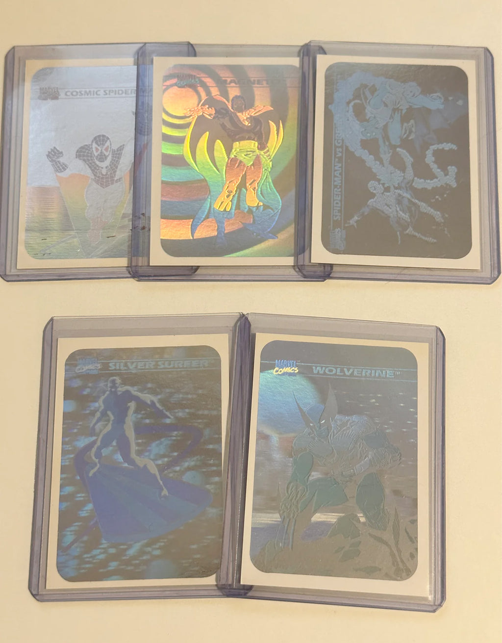 This rare 5-card hologram lot features iconic Marvel characters, including Wolverine and Spider-Man, presented in the striking holographic format that made the 1990 series so memorable among vintage card enthusiasts.