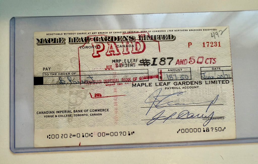 Great find autograph cheque from Maple Leaf Gardens by Bernie Parent from 1971. Sold with COA