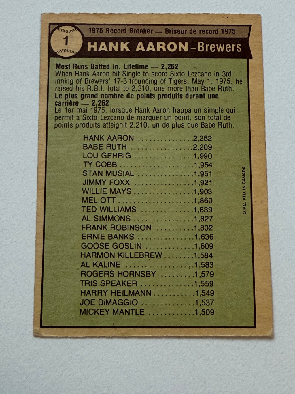 Great condition rarer Opc Canadian version baseball card of this legend, 1976