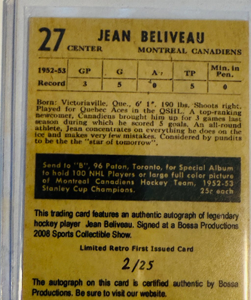 Nice investment, rookie retro autographed numbered card of this Montréal Canadiens hockey legend. 2/25. COA is on the back.