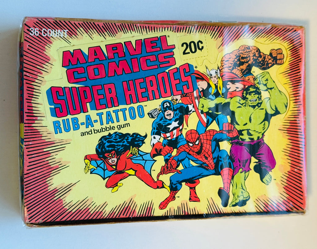 Rare find and great investment from my private collection! Marvel Superheroes rub a tattoo 36 sealed packs, box 1980
