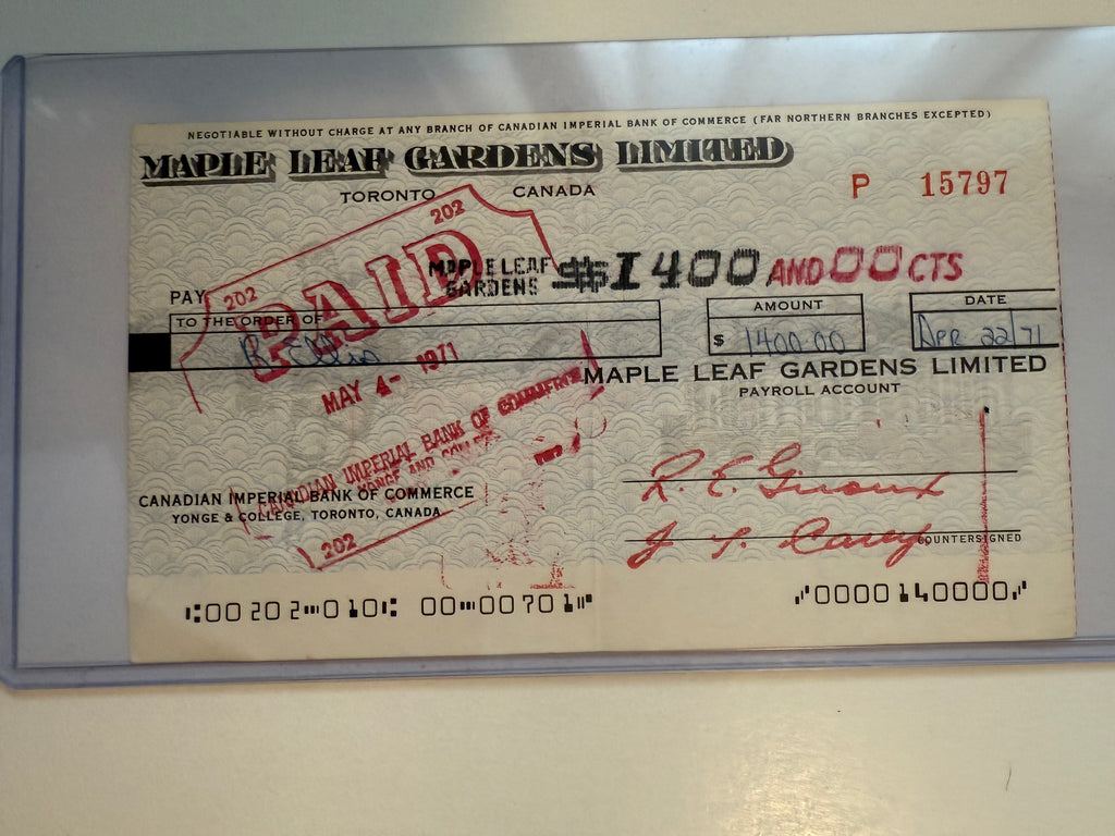 Rare find autograph leafs cheque from 1971 with COA .